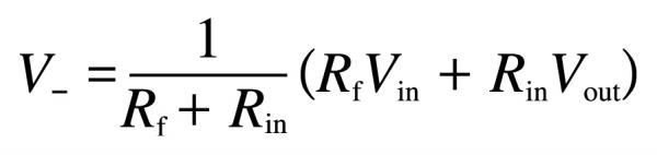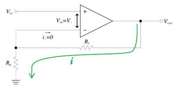 OP AMP의 입력 단자 V+와 V-에 흘러 들어가는 입력 전류는 0이고, V+와 V-의 전압은 같다. 따라서 회로에서 Vin = V+ = V- 같고, 저항 Rg와 Rf에 흐르는 전류는 같다. 저항 Rg에 흐르는 전류를 i라고 할 때, Rg에 흐르는 전류에 옴의 법칙을 적용해서 방정식을 세우면