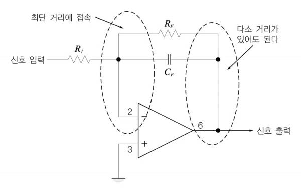 <그림 13>에 일반적인 반전 증폭 회로에 있어 회로 접속과 귀환 저항 RF의 추천 접속 예를 나타내었다. 싱글형의 경우는 핀 2로부터 핀 6 사이에 접속하게 되는데, 입력 핀 2번은 임피던스가 높은 경우가 많고, 또 신호 입력선 등이 접속하게 되어 외래 잡음 영향을 받기 쉽다. 따라서 배선 거리를 길게 하면 불리하게 되므로 가급적 짧게 해야 한다. 반면에 핀 6의 출력 쪽은 임피던스가 낮아서 외래 잡음 영향을 받는 정도가 심하지 않다. 결론적으로 귀환 저항은 입력 핀 2에 되도록 붙여서 배치한다. 만약 귀환 저항과 같이 병렬로 해서 콘덴서를 붙이는 경우도 역시 입력 핀 쪽에 위치하도록 한다.