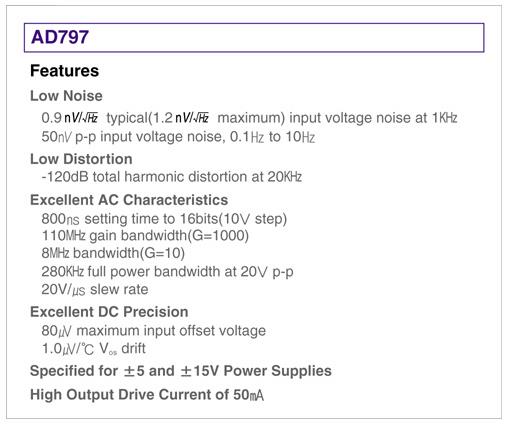 아날로그 디바이스가 설계, 제조하는 AD797는 오디오 회로에 사용하는데 있어 매우 우수한 OP AMP이다. 특히 잡음 스펙트럼 밀도가 0.9nV/√Hz라는 초저잡음 특성과 20V/㎲의 높은 슬루 레이트, 110MHz의 넓은 주파수 대역 특성은 다른 OP AMP에서는 찾기 힘들 정도이다. 극히 높은 S/N비가 요구되는 마이크 앰프, 믹서, 포노 EQ 앰프 등의 회로에 사용하기에 최적이다. 이외에 수중 소나(Sonar) 및 지진 탐지용과 같은 극히 높은 S/N비가 요구되는 곳에서도 사용된다.