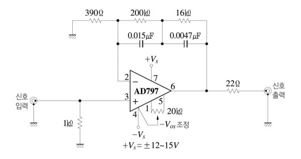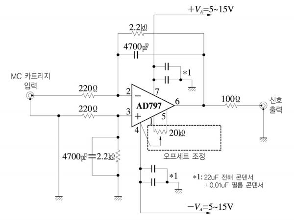 0.9nV/√Hz라는 초저잡음 잡음 스펙트럼 밀도 특성으로 입력 환산 잡음은 20KHz에서 127㎵가 되고, 출력 잡음은 11배 증폭이 되어 1.406㎶가 된다. 출력 신호 레벨을 5㎷(10배 증폭)로 하면 표준 SNR은 68.6dB이 된다. 이 AD797의 이득 대역폭은 10MHz로 매우 넓기 때문에 발진을 일으키기 쉽다. 따라서 입력 저항 220Ω과 함께 귀환 콘덴서 4700㎊으로 150KHz 이상의 대역을 차단했다.