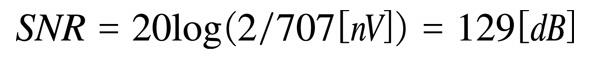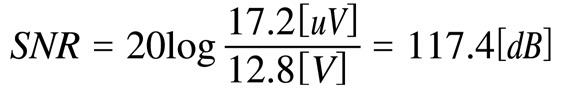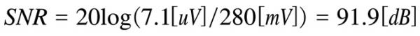 최악의 경우를 가정해 입력 환산 잡음 전압 실효치를 2V 기준 출력으로 S/N비를 계산해 보면, 오디오 주파수 20KHz 대역에 대해