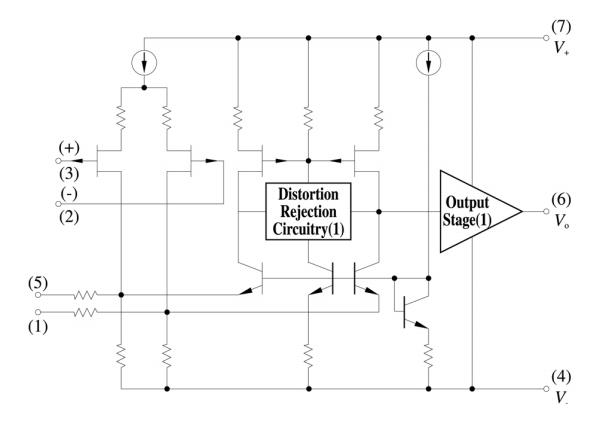 <그림 6>은 OPA604의 간략 등가 회로로, 초단은 차동 입력 회로로 FET를 사용했고, 둘째단 및 출력단도 역시 FET로 구성되어 있는 등 FET가 기본적으로 신호 증폭계에서 사용되고 있다. 하나의 특징은 둘째단의 차동 회로에 ‘왜율 제거 회로(Distortion Rejection Circuit)’라고 하는 동작점과 귀환 회로를 최적화시켜 왜율이 최소화되도록 동작하게 하는 회로가 들어가 있는 것이다. 이에 따라 상당히 낮은 THD 특성을 보여 준다. 또 하나의 특징은 오픈 루프 이득이 그리 크지 않다는 점이다. 평균적으로 100dB, 낮게는 80dB 정도로 작아서, 높은 이득을 요구하는 회로에는 그리 적합하지 않다.