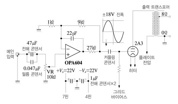 <그림 8>은 OPA604의 특징인 대진폭 신호 드라이브 능력을 이용해 진공관 파워 앰프의 입력 신호부와 드라이브 회로를 구성했다. 2A3 싱글 파워 앰프의 입력단에 진공관 대신 OPA604를 사용했는데, 전원 전압을 ±22V로 했기 때문에 ±18V(36VP-P) 정도의 대진폭 신호를 얻을 수 있다. 비반전 회로 구성으로 이득은 약 10배(20dB)를 얻도록 설계되어 있기 때문에 일반적인 라인 입력 2V(5.66VP-P)에 대해 출력단 진공관 그리드에 충분한 진폭으로 드라이브할 수 있다. 입력은 직류 전압의 유입을 방지하기 위해 커플링 콘덴서를 통하도록 했으며, 10KΩ의 볼륨을 통해 음량 조절을 가능하도록 했다. 한편 귀환 회로에는 27Ω의 저항과 22㎊의 콘덴서로 위상 보정을 했다. 잡음 특성은 1.56㎶의 입력 환산 잡음 레벨을 11배의 잡음 이득을 얻게 됨에 따라 OP AMP의 출력단에서의 잡음 출력은