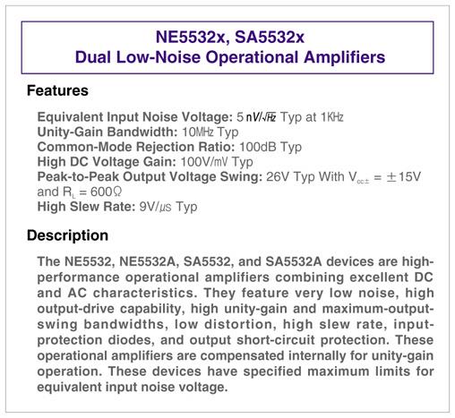 NE5532는 상당히 오래 전에 텍사스 인스트루먼트에서 개발된 OP AMP로서, 현재는 텍사스 인스트루먼트와 일본의 JRC에서 주로 생산된다. 5532가 듀얼형, 5534가 싱글형이다. 앞의 NE는 텍사스 인스트루먼트, 그리고 MJM이 붙으면 일본의 JRC에서 제조된 것을 나타내는데, 거의 동등한 특성을 갖고 있다. 또한 말미에 A또는 D의 기호가 나타나는 경우가 있는데, 이것은 우수한 잡음 특성 선별품을 표시한 것으로 잡음 최대치를 보증한다.