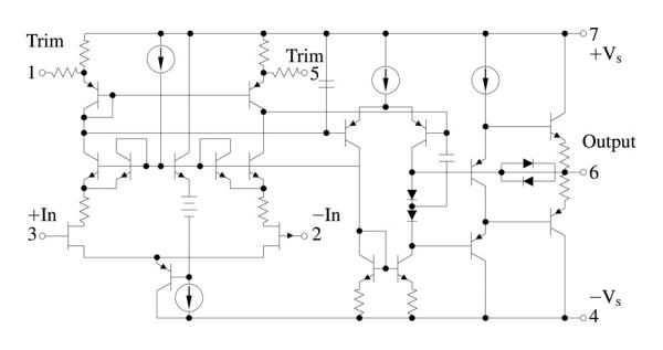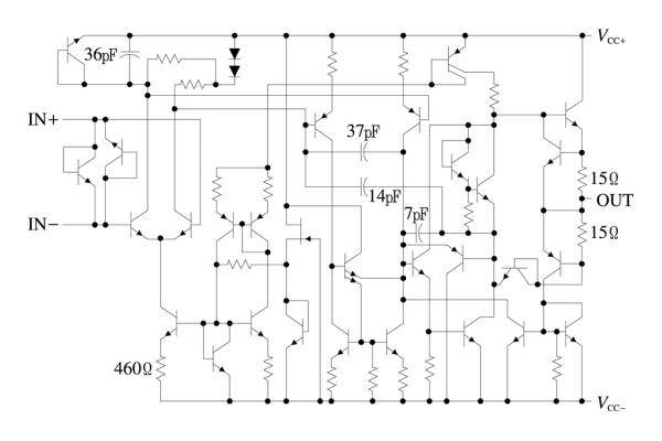 <그림 10>은 NE5532의 내부 등가 회로도이다. 바이폴라 트랜지스터 구조로 되어 있으며, 초단은 NPN 트랜지스터의 저항 부하 + 정전류 소스 구성의 차동 증폭 회로로 되어 있다. 모두 3단 구성으로, 일반적인 OP AMP의 구성과 거의 같지만, 커런트 미러 회로와 잘 조합시켜 전체적인 밸런스를 잘 잡도록 했으며, 국부적으로 귀환 콘덴서를 사용해 왜율을 낮추도록 구성되어 있다.