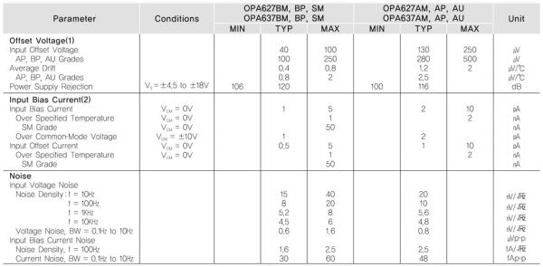 OPA627의 특성을 살펴보면, 오프세트 전압 및 바이어스 전류가 A형과 B형에 따라 다르다. 일반적인 A형은 각각 280㎶, 2㎀이고, B형은 100㎶, 1㎀이다. 일반적인 오디오용으로 사용에 있어서 A형도 충분히 사용할 수 있는 정도의 오프세트 전압을 가지고 있다. 더 정밀한 오프세트 전압 조정은 외부에 포텐셔미터(고정밀 반고정 저항)를 통해 쉽게 조정이 가능하다. 바이어스 전류도 다르지만 입력부가 FET 소자로 되어 있어서 바이어스 전류가 매우 낮아 일반적인 오디오용으로 사용함에 있어서는 전혀 문제가 되지 않는다.