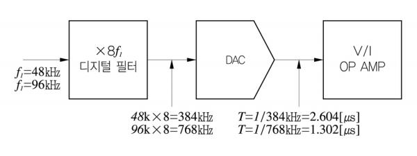 <그림 15>는 일반적인 멀티 비트형 DAC 회로 구성 블록 다이어그램과 동작 속도를 표시했는데, 보통 DAC 전단에서 디지털 필터를 통하여 8배 오버 샘플링을 하기 때문에 기준 샘플링 레이트 fS의 8배 속도로 동작한다. 따라서 기준 샘플링 레이트가 48KHz, 96KHz일 때 실제 동작은 이의 8배 속도로 하므로 그것을 시간 변환해 보면 각각 2.604㎲, 1.302㎲이 되는데, OPA627은 0.0015% 정도에서 세틀링 타임이 1.25㎲이기 때문에 상기의 동작 속도에 충분히 대응하는 고속 응답성을 갖고 있음을 알 수 있다. 다른 OP AMP는 이 세틀링 타임에 대한 값을 제시하지 않고 있거나, 있어도 충분하지 않은 경우가 많으므로 위와 같은 멀티 비트형 DAC 회로에 사용에 있어서는 주의를 요한다.
