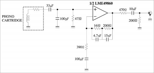 LME49860의 초저잡음, 높은 이득을 얻을 수 있는 장점을 잘 살릴 수 있는 부분이 포노 이퀄라이저 회로이다. <그림 4>에 포노 이퀄라이저 앰프 회로를 나타내었다. 이 회로는 1KHz에 있어 신호 이득은 35dB(AV = 56.23)로 설정했는데, 이때 입력 환산 잡음 실효값은 n = 0.33㎶가 된다. 입력 신호 레벨을 10㎷라고 하면 잡음 출력은