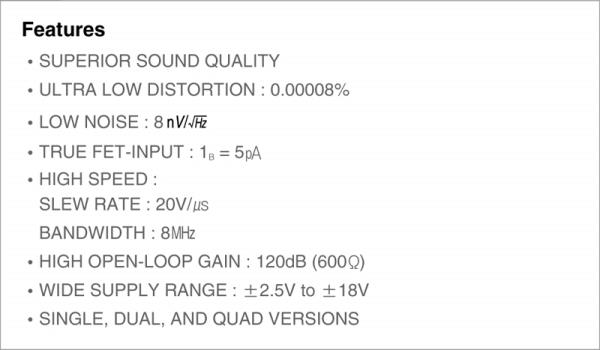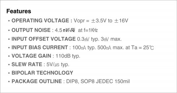 <그림 7>에 데이터 시트 중 주요 특성을 기술한 부분을 발췌했는데, 특히 오디오용을 중점으로 사용할 목적으로 개발되었음을 밝히고 있다. 다만 저잡음 OP AMP라고 해도 다른 오디오용 OP AMP(예를 들면 NE5532)보다는 다소 성능이 떨어진다. 특기할 만한 점은 슬루 레이트가 상당히 높다는 점으로, 동적 특성이 우수해 음질적으로도 좋은 방향으로 기여를 하는 것 같다.