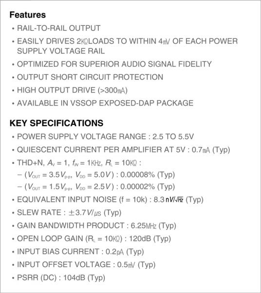 LME49726은 이러한 레일 투 레일형 OP AMP의 대표적인 모델의 하나인데, 특히 휴대형 오디오 기기에 사용하는 것을 목적으로 개발되었고, 2채널 스테레오 회로 구성에 알맞게 듀얼형 회로이다. <그림 14>에 데이터 시트에서 발췌한 주요 특성을 표시했다.