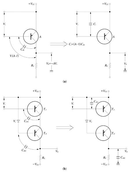 트랜지스터는 FET와 달라 베이스-이미터 간의 순방향으로 전압이 걸릴 때는 임피던스가 낮아져서 이들 사이의 접합 용량은 문제가 없지만 역방향으로 전압이 걸리게 되면 콜렉터와 베이스 간의 접합 용량 Cob에 따라서 문제가 발생한다. <그림 1>의 이미터 접지 증폭 회로에 있어 입력 정현파 전압 Vi는 이득 A에 따라 증폭되어 AVi가 되고, 컬렉터에는 역 위상으로 나타난다. 입력 정현파의 주파수를 f라고 하면 Cob의 임피던스는 1/(2π*fCob)가 된다. Cob에는 AVi - Vi = Vi(A-1)의 전압이 걸리고 2πfCob·Vi(A-1) 크기의 전류가 흐르게 된다. 이는 입력 측에서 보면 Ci = Cob(A-1)의 콘덴서 용량이 있는 것과 같이 된다.