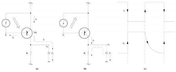 <그림 4>와 같이 pnp 트랜지스터의 싱글 앰프에서 입력 전압 Vi가 펄스 형태의 경우를 생각해 보자. Vi의 전압이 강하함에 따라 IB, IC가 증가하고 CL에는 충전 전류가 흘러 급속히 충전되고, VO는 Vi에 추종해 빠르게 변화한다. 하지만 Vi의 전압이 상승할 때는 IC는 감소하고, CL에 충전된 전기는 RC를 통해서 서서히 방전된다. 방전 전류는 RC가 클수록 더 작아져서 방전에 필요한 시간이 더 많이 걸린다. 따라서 방전 시간은 RC와 CL의 곱에 따라 비례해 길어진다. 이 RC와 CL을 시정수라고 한다.