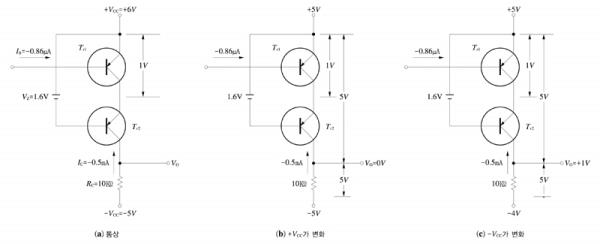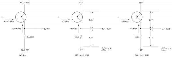 그런데 <그림 6>과 같이 싱글 앰프라도 캐스코드 접속 회로인 경우는 +공급 전압 VCC가 변화하더라도 Tr1의 VCE는 언제나 1V로 고정되어 있기 때문에 IC는 변하지 않아 RC에 걸린 전압도 +5V로 일정하게 된다. 때문에 +공급 전압이 변화하더라도 +VCC가 1.2V에 이르기 전까지는 이는 출력에는 나타나지 않는다. 단 -공급 전압의 변화 분은 <그림 6-c>에서 보는 바와 같이 출력 측에 그대로 나타난다. 이 같이 pnp 캐스코드 접속 회로는 +공급 전압의 변동에 극히 강한 회로임을 알 수 있다.