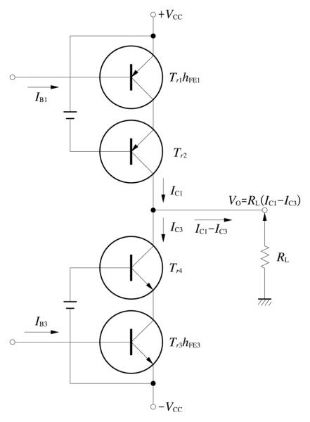 무신호 시에는 IC1 = IC2여서 부하 저항에는 전류가 흐르지 않아 출력 전압 VO는 0이 된다. 하지만 IC1 > IC2이면 IC1 - IC2만큼의 전류가, IC1 < IC2이면 - (IC1- IC2)만큼의 전류가 부하 저항에 흘러 출력 전압이 만들어지게 된다. 이 같이 부하 저항에는 Tr2, Tr3의 차의 전류가 흐르는 푸시풀로 합성된 전류를 통해 출력 전압이 발생하게 된다.