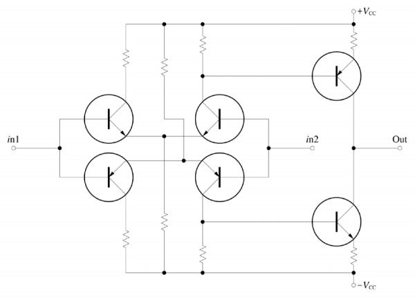 <그림 12>와 같은 차동 앰프로는 독립한 2개의 싱글 앰프밖에는 되지 않는다. 이 두 싱글 앰프를 푸시풀로 합성해 본격적인 오디오 앰프로 동작시키기 위해서는 커런트 미러(Current Mirror) 회로라고 하는 일종의 전류 증폭기를 부가해야 한다. 이 커런트 미러 회로는 정전류 회로로 베이스 접지 회로로 구성된다.