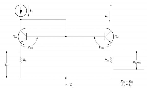 실제 회로에서는 다이오드 접속을 한 Tr1의 VBE1이 트랜지스터 동작을 하는 Tr2의 VBE2보다 5% 정도 더 크기 때문에 RE1의 값을 RE2보다 5% 정도 더 크게 해서 사용한다. 또 Tr1 대신 고주파 특성이 좋은 스위칭 다이오드를 사용하기도 한다.