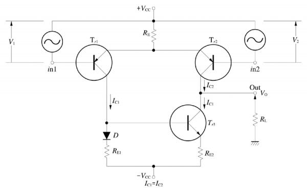 차동 앰프 회로에 있어 RE는 무신호 시의 전류를 안정화하는 방향으로 작용한다. 온도가 상승하면 컬렉터 전류 IC가 증가하는데 Tr1, Tr2는 페어 트랜지스터로 이루어졌기 때문에 IC1, IC2도 같은 양만큼 증가하고, RE를 통한 전압 강하 RE(IC1+IC2)도 증가해서 베이스와 VCC 간의 전압 Vi가 일정하다면 VBE를 감소시켜 IC1, IC2도 감소시키는 역할을 한다.