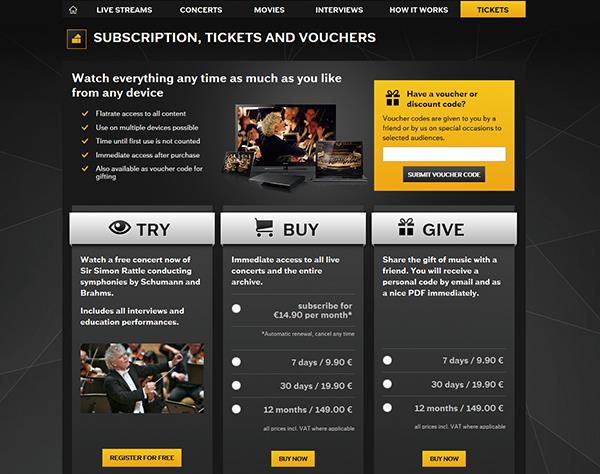 2. PC에서 www.digitalconcerthall.com에 접속한 뒤 메인 화면 우측 상단에 ‘TICKETS’를 선택하면, 7일, 1개월, 1년 정기권을 선택할 수 있고, 신용카드로 결제하면 된다.