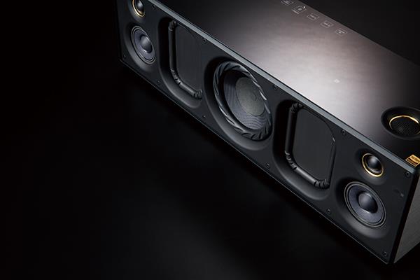 전면의 그릴을 벗기면 효율적으로 배열한 유닛이 그대로 드러나는데(제공하는 그릴 제거 자석을 사용해야 한다), 슈퍼 트위터, 마그네틱 플루이드 유닛, 서브우퍼, 패시브 라디에이터 등이 최적으로 배치되어 있다. 서브우퍼는 9.4cm가 채용되었고, 우퍼 좌·우에는 저역의 효율을 높일 패시브 라디에이터가 장착되어 있다. 이로써 45Hz의 저역이 가능한데, 미니 사이즈의 제품치고는 꽤 낮은 저역의 커버이다. 이 서브우퍼를 위해 2개의 앰프가 동원되는데, 저역은 굉장히 자연스럽고, 고효율로 다이내믹을 강조한다는 인상. 중·고역은 마그네틱 플루이드 스피커가 담당하는데, 댐퍼 대신 자성 유체(Magnetic Fluid) 서스펜션을 적용한 것이 특징이다. 유닛의 댐퍼 진동 때문에 노이즈와 왜곡을 준다고 판단, 과감하게 댐퍼를 제거하고 자성 유체를 도입한 것은 확실히 특별하다. 덕분에 유닛 구동에서 효율 높였고, 노이즈와 왜곡을 최소한으로 줄인 것인데, 실제 시청에서도 굉장히 매력적인 중·고역이 흘러나왔다. 마지막으로 트위터는 무려 4개나 채용했는데, 특이하게도 전면에 2개, 상단에 2개로 분산 배치했다. 역시 공간감과 정위감을 높이기 위한 레이아웃으로, 청취자의 위치 변화에도 최대한 흐트러지지 않는 무대를 들려주기 위한 아이디어로 보인다. 특히 슈퍼 트위터를 강조하는 것으로, 고음질 음원의 광대역 재생을 위한 핵심이기도 하다. 앰프는 무려 8개나 동원되는데, 모든 앰프는 각각의 유닛을 담당하며(우퍼만 더블 구성), 총 154W의 출력을 만들어낸다. 전체적으로 구동의 효율을 높이고, 음의 퀄러티를 높이고자 하는 설계가 돋보이는 구성이다.
