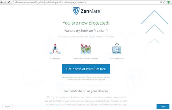 2. Chrome 브라우저에서 링크를 통해 접속하여 ‘Zenmate’ 접속 후 ‘Get 7 days of Premium free’ 버튼 선택