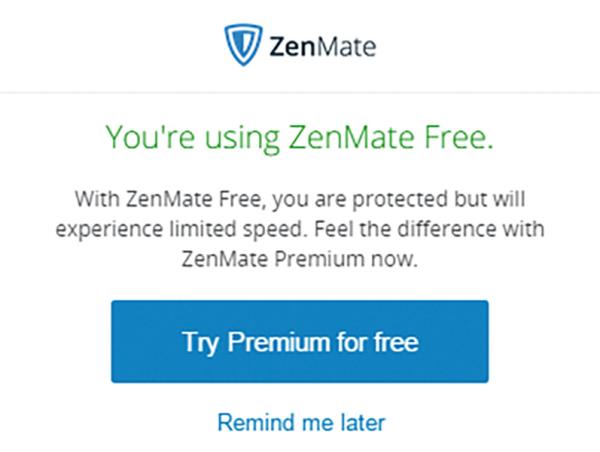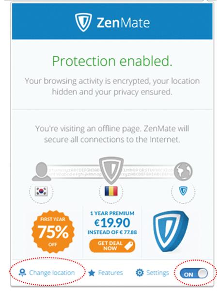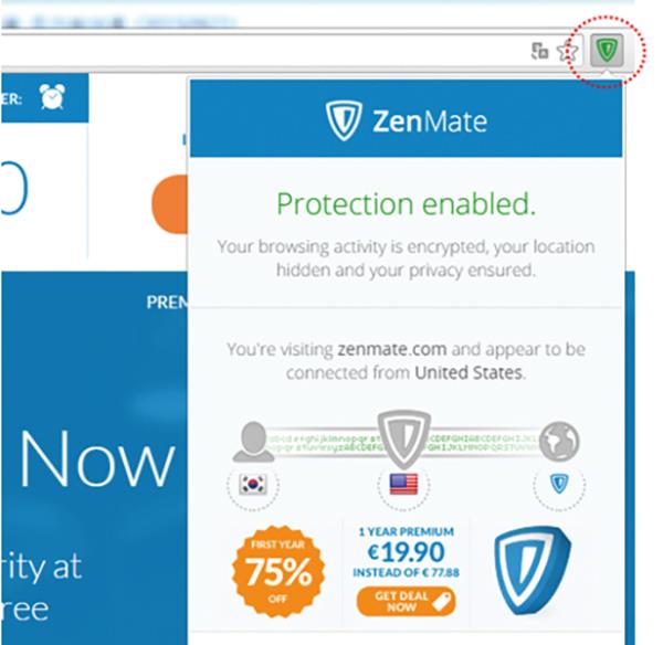 3. 우측 상단에 ‘ZenMate’ 마크 선택 하면 아래 팝업이 나타남