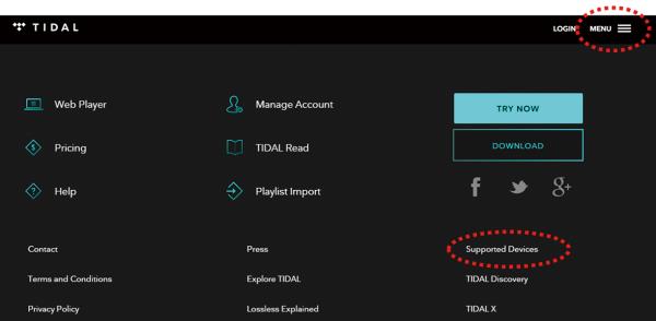 1. Tidal 우측 상단 ‘MENU’ 진입 후 ‘Supported Devices’ 선택