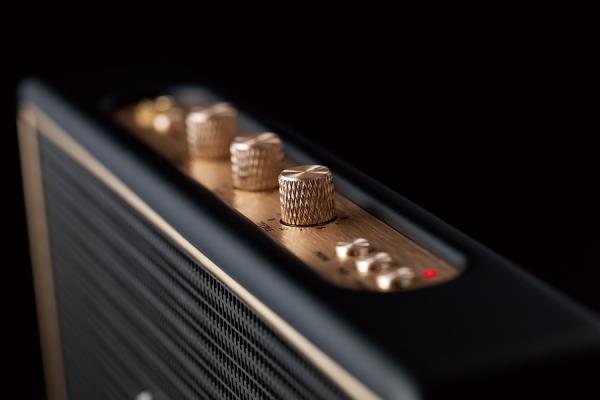 이렇게 스톡웰은 다른 마샬 블루투스 스피커보다 크기는 작아졌다. 하지만 남성미 철철 넘치는 마샬 특유의 디자인을 고스란히 담고 있고, 변함없는 커다란 마샬 로고와 기기 상부의 금색 패널이 선사하는 매력도 여전하다.