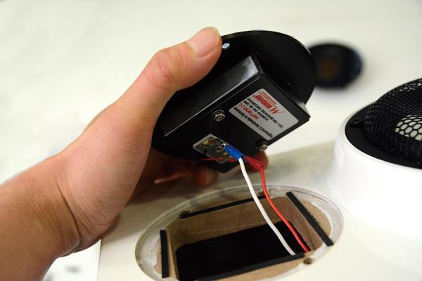 ① 전면 상단 구멍에 적색(+)과 흰색(-)의 트위터 케이블을 빼내고, 케이블을 극성에 맞게 AMT 트위터 단자에 연결한다.