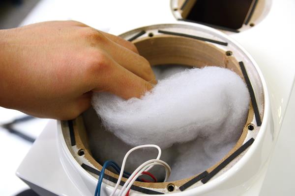 내부 흡음재는 스피커 내부 정재파 방지와 내부 부품들의 공진 현상을 억제하기 위해 설치하게 되는데, 바닥 네트워크와 후면 단자 부위를 중심으로 골고루 퍼지도록 솜을 채운다.