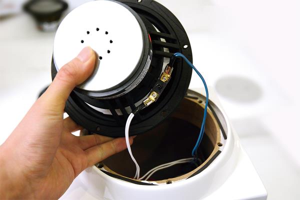 ① 전면 하단 구멍에 청색(+)과 흰색(-)의 우퍼 케이블을 빼내고, 케이블을 극성에 맞게 우퍼 단자에 연결한다.