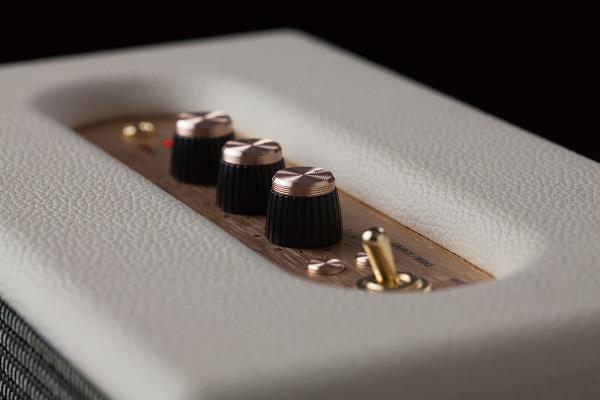 상단 컨트롤 부에서는 마샬의 특징 중 하나인 기타 앰프 콘셉트의 노브들을 볼 수 있다. 특히 볼륨 조절, 트레블·베이스 톤 컨트롤 등은 영락없는 기타 앰프의 모습이다. 전원 스위치마저도 기타 앰프의 그것을 그대로 담았는데, 블루투스 스피커라고 이야기하지 않으면 아마 포터블 기타 앰프라고 생각할지도 모르겠다. 소스·웨이크, 블루투스 기능은 버튼으로 선택할 수 있는데, 금색 마감으로 버튼감도 만족스럽다. 전체적으로 금색 톤을 강조하고 있어서, 고전적인 느낌과 고급스러운 이미지가 잘 조화되어 있다.