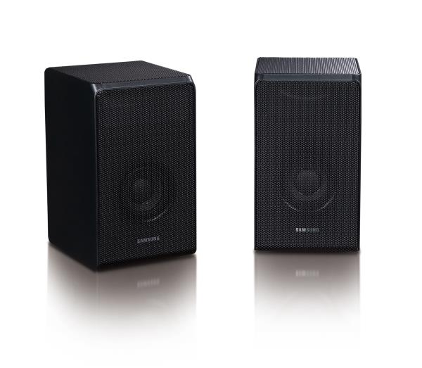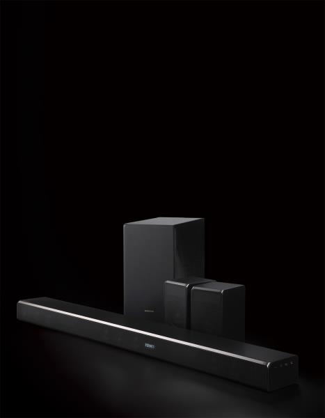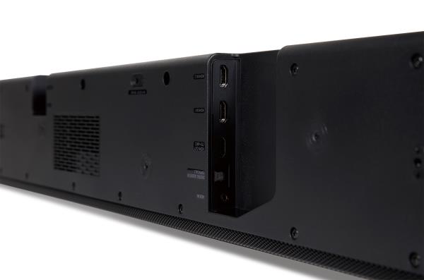 이 사운드바 제품의 또 다른 특징은, 최신 객체 기반 멀티채널 오디오 포맷인 돌비 애트모스 포맷을 구현하는 5.1.4채널 사운드바 제품이라는 것이다. 제품을 살펴보면 사운드바와 리어 스피커에 사운드를 천장으로 쏘는 돌비 애트모스 인에이블드 스피커가 추가되어 있는 것을 알 수 있다.
