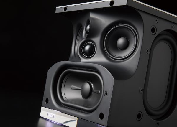 각설하고, 본 기의 외관은 정사각형이다. 따라서 앞면 여기저기에 대충 유닛을 달았겠구나 생각하기 쉽지만, 실상은 그렇지 않다. 그릴을 뜯어보면 알겠지만, 무척 복잡한 형상으로 드라이버를 장착하고 있다. 예를 들어 두 개의 트위터는 각각 방향이 다르다. 완만한 곡선을 그리는 패턴으로 서로 다른 방향을 응시하고 있다. 또 트위터 양쪽에 난 미드레인지 역시 정확하게 바깥쪽을 향하도록 장착되어 있다. 다시 말해, 중앙에 트위터가 있는 가운데, 미드레인지가 좌우 밖을 지향해서, 더 사운드 스테이지를 넓게 그려가고 있는 것이다. 그런 와중에 우퍼는 큼지막한 사이즈로 단 한 발이 밑에 설치되어 있다. 저역이야 특정한 방향성이 없는 만큼, 오히려 구경을 키워서 임팩트를 준다는 설정이다. 일종의 서브우퍼의 역할이라고나 할까?