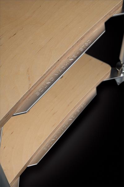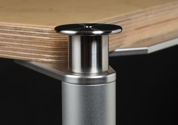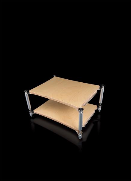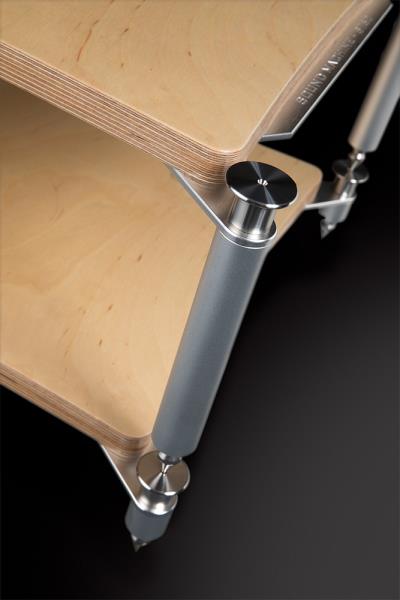 기본 판재는 24T 자작나무 합판을 사용하여, 아날로그적인 향수와 견고함을 함께 갖추고 있다. 기둥인 샤프트와 지지대는 AL6061 소재를 가공한 뒤, 아노다이징 마감으로 깔끔하게 처리했다. 연결 부속과 스파이크는 강도가 높은 SUS303과 SUS304를 자동 선반으로 가공한 뒤, 무광택 처리하여 고급스러움을 제공한다. 이외 부속으로 슈즈도 제공하고 있다. 또한, 제품 설계 시 진동과 공진을 최소화하기 위해 각 단별 개별 스파이크를 적용하였으며, 자작나무 합판의 아래쪽에 6T 두께의 분리형 지지대 구조를 적용하였다.