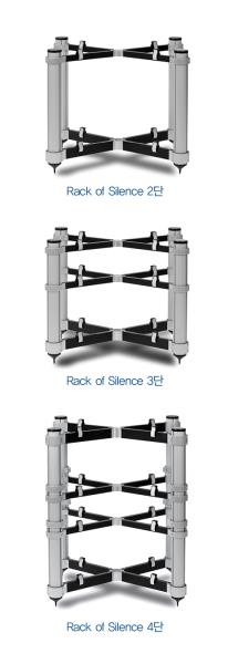우선 랙 오브 사일런스는 솔리드 테크의 간판 모델로 실버 톤의 모던 클래식 디자인이 일품이다. 역시 빠르고 간편한 설치를 특징으로 하고, 다양한 옵션으로 유저 시스템에 맞는 오디오 랙 구성을 추구할 수 있다. 단수를 선택할 수 있고, 선반 소재에 따라 레퍼런스 버전과 레귤러 버전로 구분된다. 레퍼런스 버전은 아노다이징 처리된 알루미늄, 레귤러 버전은 목재로 구성되며, 카본을 사용한 포뮬러 버전도 출시하고 있다. 4개의 두툼한 원통형 알루미늄 코너 기둥에는 각 단마다 X자 형태의 선반을 부착했는데, 최소 면적을 중심으로 한 과학적인 이론과 측정치를 바탕에 둔 설계 방식이 깃들어져 있다. 이는 외부 진동과 기기 자체 진동을 컨트롤하는 중심축이기도 하다. 이 X자 선반에는 4개의 인슐레이터를 결합시킬 수 있는데, 알루미늄, 실리콘, 코르크 등을 조합하여 진동에 대한 방어책을 철저히 심어두고 있다. 각 선반에는 스프링 방식의 서스펜션이 장착되어 있는데, 역시 효율적인 진동 컨트롤과 독립적인 진동 제어의 핵심적인 역할을 한다. 기둥과 인슐레이터는 모두 마치 방열판 같은 물결 무늬 디자인이 채용되어 있는데, 솔리드 테크만의 디자인 아이덴티티와 더불어 에너지 분산을 위한 설계로 제작된 것이다. 고품질 스파이크 역시 장착, 진동 방지를 위한 정확한 중심축을 만들어 준다.