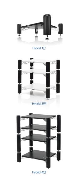 다음으로 하이브리드이다. 역시 쉽고 다양하게 조합할 수 있는 구성이며, 시스템이 추가될 때마다 단수를 쉽게 늘릴 수 있다는 장점이 있다. 코너 기둥은 하나의 긴 원통형 디자인이 아닌 길게는 35cm, 짧게는 20cm로 구성되어, 자신이 원하는 대로 가로나 세로로 확장시킬 수 있다는 것이 메인 콘셉트이다. 사진으로 보면 이해하기 쉬운데, 오디오 애호가들의 고민을 꿰뚫는 명쾌하고 매력적인 솔루션이다. 랙 오브 사일런스가 X자 선반이 중심이었다면, 하이브리드는 사각의 평면 선반을 메인으로 한다. 길이는 49×43.5cm(WD) 사양. 평면 선반을 위해 4개의 받침대를 기둥에 설치하게 되는데, 이 역시 정확한 설계법과 솔리드 프레임워크 디자인으로 특별히 제작된 것이다. 각 코너 기둥은 바닥에 스파이크로 고정되며, 옵션으로 서스펜션 구조의 디스크 오브 사일런스(Discs of Silence)를 선택할 수 있다. 신제품으로 하이브리드 사이드보드 & 커퍼(Hybrid Sideboard and Cupper)가 출시되어 있는데, 사이드보드가 추가되어 있고, 유니크하고 고급스러운 색상을 품고 있다.