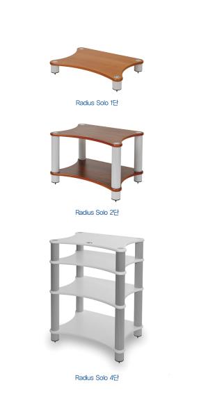 마지막으로 래디우스이다. 여러 색상의 리얼 우드 베니어가 인상적인 제품으로, 역시 다양하게 조합할 수 있는 콘셉트를 품고 있다. 코너 기둥과 선반의 간단한 조합이지만, 오디오 랙으로서의 기본기가 탁월한 제품으로 오디오 애호가들에게 많은 인기를 얻고 있기도 하다. 단수와 구성에 따라 솔로 1, 솔로 2, 솔로 3 F1, 솔로 4, 솔로 5, 솔로 6 HT, 듀오 2, 듀오 3, 시네마 5, 시네마 8 등으로 나뉘어 있고, 카본이 적용된 포뮬러 선반을 선택할 수도 있다.