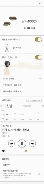 이 제품을 위해 소니에서 만든 스마트폰 앱인 ‘Headphones Connect’를 사용해야 이 이어폰의 모든 것을 사용한다고 할 수 있다. 이 앱에서 가장 매력적인 것은 현재 내가 어떤 상태인지에 감지해 노이즈 캔슬링을 조절한다는 것이다. ‘적응형 사운드 제어’라는 이 기능은 내가 정지 상태, 걷는 중, 뛰는 중, 차량 이동인 것을 스스로 감지해 ‘주변 소리 제어(노이즈 캔슬링, 주변 사운드 - 음성 모드, 주변 사운드 - 표준 모드)’를 결정해 어떤 소리는 들리게 하고 어떤 소리는 들리지 않게 한다. 그리고 적응형 사운드 제어에 따라 주변 소리 제어 설정을 개개인이 직접할 수도 있고, 적응형 사운드 제어를 끄고 주변 소리 제어 설정을 직접할 수 있다. 참고로 주변 소리 제어 중 주변 사운드 - 표준 모드는 주변의 소리를 들리게 해 주고, 주변 사운드 - 음성 모드는 음성을 들을 수 있게 해 지하철 도착 등을 알리는 소리를 놓치지 않게 한다. 그리고 이퀄라이저 기능도 사용할 수 있는데, 밝음, 신남, 부드러움, 편안함, 보컬, 트레블 부스트, 베이스 부스트, 스피치와 같은 다양한 설정이 있다. 또한 블루투스 연결에서 음질을 우선할 것인지 안정적인 연결을 우선할 것인지도 선택할 수 있고, 배터리 충전 상태와 연결 코덱도 표시된다.