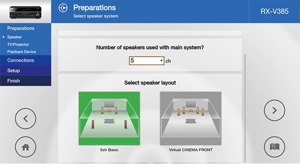 입·출력을 살펴보면, HDMI는 입력 4개, 출력 1개가 있고, 모니터 아웃으로 컴포지트 비디오 출력 1개가 있으며, AV 입력이 컴포지트 비디오 입력 3개와 코액셜 1개, RCA 2조로 구성되어 있다. 오디오 입력으로는 옵티컬 1개와 코액셜 1개가 있다. FM, AM 안테나 단자가 있다. 기기 전면에는 6.5mm 헤드폰 단자와 3.5mm Aux 입력이 있고, USB-A 단자도 있어 USB 메모리 스틱에 음악 파일(PCM 16비트/48kHz까지)을 넣어 재생할 수 있다. 그리고 RX-V383에서 RX-V385로 업그레이드되면서 스피커 연결 단자가 스프링 단자에서 전부 바인딩 포스트로 변경되었다. RX-V385는 5.1채널 AV 리시버 제품으로, 총 5조의 바인딩 포스트를 갖추고 있으며, 1개의 서브우퍼 아웃 RCA 단자가 있다. 그리고 이 AV 리시버는 설정을 통해 바이앰핑으로 프런트 스피커를 구동할 수 있는데, 이럴 경우 서라운드 스피커를 연결할 수 없다.