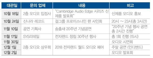 11월에도 뜻깊은 행사가 준비되어 있는데, 11월 10일(토)에는 송춤새 20주년 기념 공연 행사가 18시 30분부터 20시 30분까지 진행되고, 11월 17일(토)에는 유명 가수 초청 및 다양한 공연이 준비된 전자랜드 창립 30주년 행사를 만나볼 수 있다. 그리고 매년 정기적으로 진행되는 제7회 2018 용산 전자랜드 월드 오디오 페어가 11월 30일부터 12월 2일까지 3일간 개최되는데, 오디오 애호가라면 꼭 기억해야 할 이벤트가 될 것이다.