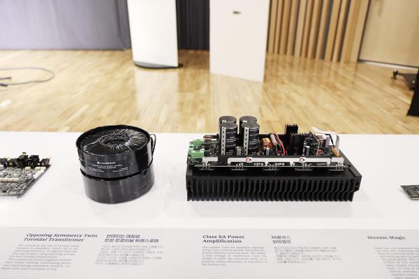 새로운 에지 시리즈는 총 3가지 모델로 출시된다. 에지 A 인티앰프, 에지 NQ 프리앰프·네트워크 플레이어, 에지 W 파워 앰프의 구성이다. 총 3년의 개발 기간을 거쳤고, 9명의 엔지니어들이 투입된 플래그십 라인업이다. 이번 시청회에는 이 에지 시리즈가 모두 등장했는데, B&W 803 D3 스피커를 중심으로 에지 NQ 프리앰프·네트워크 플레이어, 에지 W 파워 앰프를 세팅해놓았고, 한 켠에는 에지 A 인티앰프가 전시되어 있었다. 특히 노브 부품들을 분해·전시해놓기도 했는데, 31개의 부품이 아름답게 수놓아져 있는 모습이 그야말로 장관이었다.