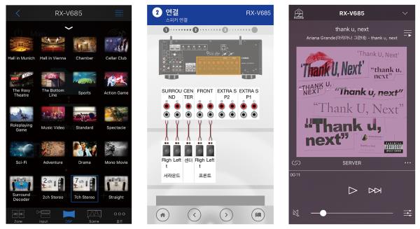 다양한 전용 앱(애플, 안드로이드)이 마련되어 있는데, 네트워크에 연결된 여러 야마하 제품을 컨트롤하고 음악을 재생하는 멀티 룸 오디오 앱인 뮤직캐스트, 스마트폰과 태블릿을 리모컨처럼 사용해 AV 리시버의 다양한 기능을 제어할 수 있는 앱인 AV 컨트롤러, 기기 설치를 쉽게 할 수 있도록 도와주는 앱인 AV 셋업 가이드가 있다.